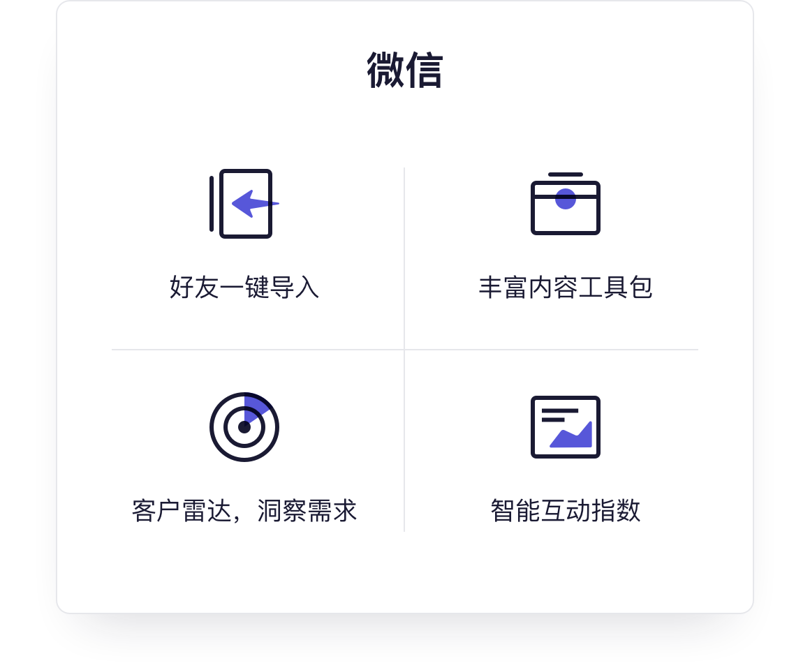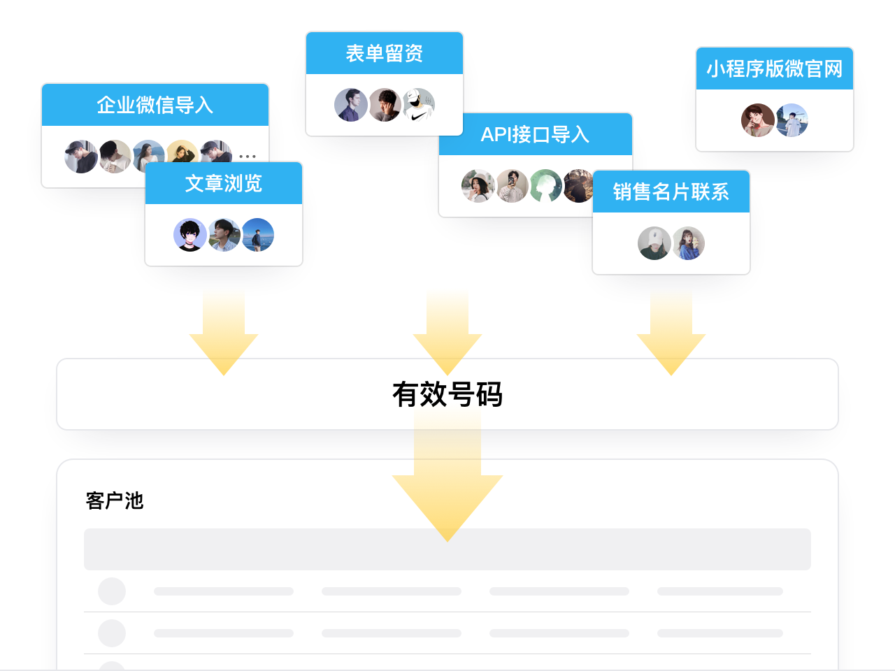 你可以使用互客提供的内容工具包,通过社交渠道传播。 感兴趣的客户可以通过专属销售名片联系到你,表单留资客户也会直接导入你的客户池。 你还可以把企业微信好友一键导入客户池,或通过API接口把官网注册留资线索直接导入客户池。 线索经过清洗后,筛选出更精准的线索给到销售跟进。