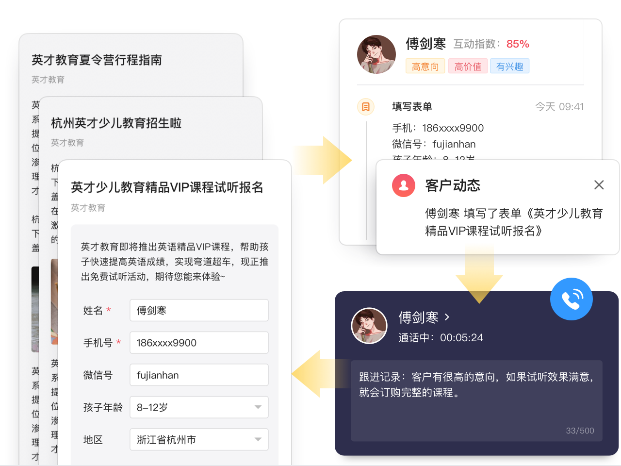 你可以在微信中持续给客户发送内容种草。客户浏览相应内容时,会及时通知跟进销售。 不用客户说出口,即可洞察客户需求。互客还会根据记录客户互动旅程,智能计算出客户的“互动指数”,帮助你找到更有价值的客户。 趁客户对产品兴致满满的时候,快给客户去个电话,努力推进成交吧~